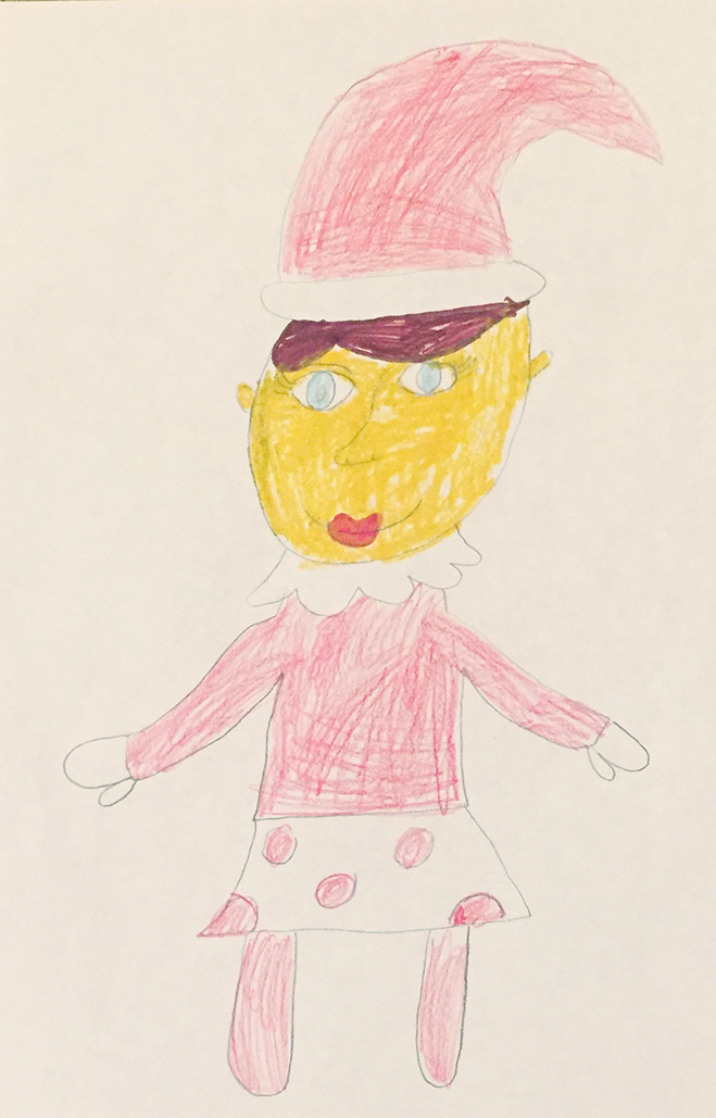 The holiday season brings families together in a variety of ways. One such tradition Sarah and Ryan delight in is the annual hiding of the Elf on the Shelf for their three children, Hudson (age 10), Helen (age 7) and Oliver (age 5). Have a kid that’s too grown up to believe in Santa Claus and elves? A great way to include them is to have your child help mom and dad hide elves for younger siblings, just like Hudson does with Sarah and Ryan. A fun way to keep small kids excited and involved is to have them draw pictures of their elves for the family, as Helen did so sweetly in the drawing above. Remember that when hiding your elves, make sure the coast is clear! Oliver nearly caught Sarah while she was up on a chair, but a quick explanation of dusting saved the day. The Elf on the Shelf is a great activity for the whole family that your young ones will love and look forward to during the holidays. Check out below, where Sarah shares some of their favorite elf hiding places: